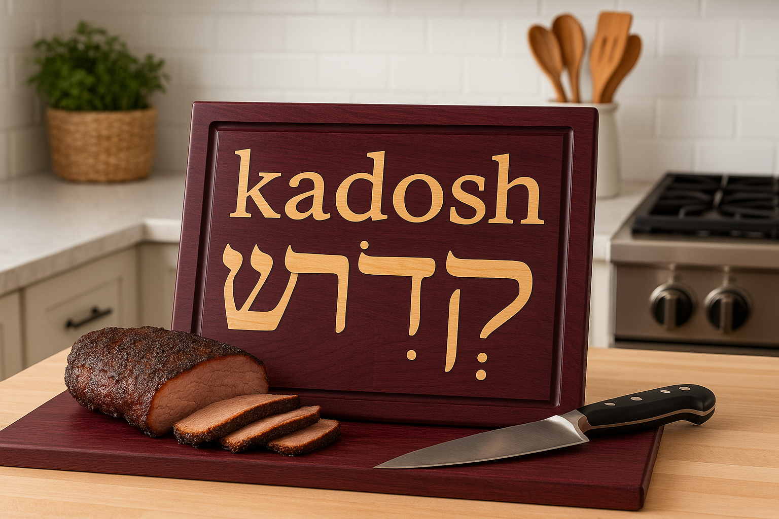 The Red Tail Signature End Grain Board – KADOSH Inlay Edition is a bold blend of craftsmanship and meaning. Measuring 20” x 16” x 1.5”, this premium board features a deeply symbolic KADOSH inlay—Hebrew for “holy” or “set apart”—meticulously crafted in maple and set into your choice of a rich walnut or striking purpleheart base.
