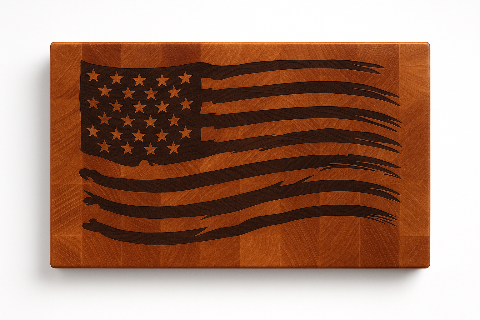 Crafted from premium maple and inlaid with a striking tattered U.S. flag in rich walnut, this board stands as a bold tribute to resilience and American pride. Each flag is precision-cut and seamlessly inlaid for a detailed, lasting finish that highlights the contrast between light and dark hardwoods.